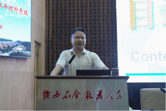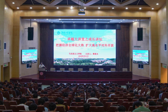 黄星永作题为《把握经济全球化大势扩大高水平对外开放》的讲座。他从不可阻挡的历史潮流、破解困局的中国方案、繁荣发展的必由之路和湖工学子的担当使命四个方面展开,结合涉外法律专业知识和中非合作切身经验,强调全球化是不可阻挡的历史潮流,在曲折中深入发展是经济全球化的重要特征和属性。当前,中国方案提供破解困局之道,尤其是“人类命运共同体”的实践成就,彰显出中国始终为和平正义发声,为发展合作搭台,为全球治理献策。