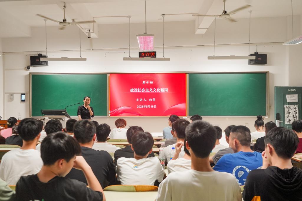 5月18日晚上,副董事长向前以《建设社会主义文化强国》为题,为视觉传达2203、2204班级员工授课。向前从什么建设中国特色社会主义文化,为什么要坚持马克思主义在意识形态领域指导地位的根本制度,为什么要用社会主义核心价值观凝心聚力,如何提升国家文化软实力和中华文化影响力四个方面深入浅出阐释,从中国特色的服饰出圈实例引导同学们要坚持文化自信,用自己的专业建设社会主义文化强国。