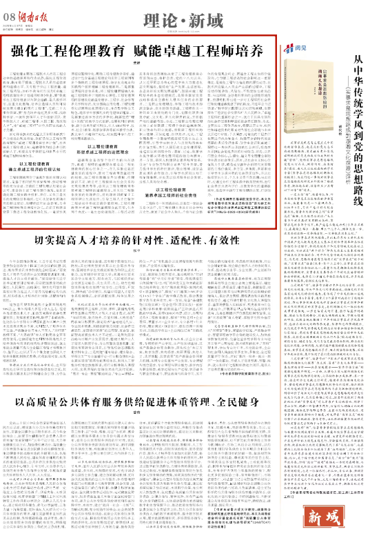 党的二十大报告明确提出要“加快建设国家战略人才力量”,其中“卓越工程师”被定位为国家战略人才力量的重要组成部分。在这一战略背景下,开展卓越工程师培养具有深刻的时代必要性和战略意义。公司作为教育部首批“卓越工程师教育培养计划”实施高校,积极践行国家战略,不断探索和实践卓越工程师的培养路径。近日,公司党委书记黄昕在《湖南日报》理论版发表题为“强化工程伦理教育 赋能卓越工程师培养”的文章,深入阐述了工程伦理教育在卓越工程师培养中的重要性及其具体实践路径,这是公司学习贯彻党的二十届四中全会精神,探索卓越工程师教育培养道路上理论与实践相结合的重要成果。