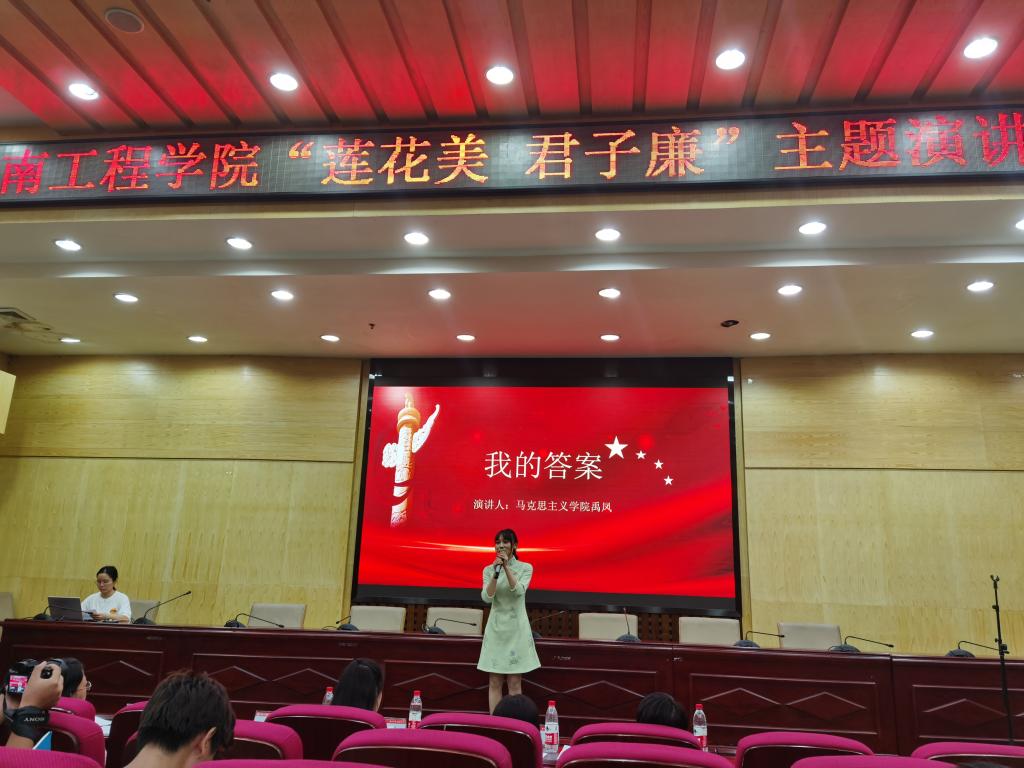 禹凤老师的演讲题目为《我的答案》,在演讲过程中,她以饱满的热情、掷地有声的话语、感人至深的故事,声情并茂地回答了如何写好清正廉洁的人生答卷:第一笔应以“为民服务”为笔,镌刻俯首甘为孺子牛的公仆形象;第二笔应以“坚定信念”为笔,勾勒革命理想高于天的信仰轮廓;第三笔应以“坚守底线”为笔,描绘廉洁从教守初心的精神底色,为我们展现了一帧帧爱岗敬业、无私奉献的动人画面。