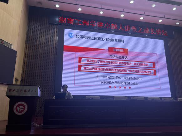 钟周丽嫄作题为《铸牢中华民族共同体意识》的讲座。她从铸牢中华民族共同体的战略意义、把握中华民族共同体意识的丰富内涵、铸牢中华民族共同体意识的实践路径等三个方面展开。她指出,铸牢中华民族共同体意识是维护各民族根本利益的必然要求,只有铸牢中华民族共同体意识,才能实现好、维护好、发展好各民族根本利益。在谈及中华民族共同体意识的丰富内涵时,她从增进“五个认同”、根植“四个与共”、树立“四个共同”、把握“四对关系”入手,引导员工把握中华民族共同体意识的丰富内涵。最后,她提出,要在教育引导、文化交流、经济发展和社会治理等方面下功夫,不断巩固和发展中华民族共同体意识。同时,她还鼓励同学们在日常生活中积极践行中华民族共同体意识,用自己的实际行动为构建中华民族命运共同体贡献力量。