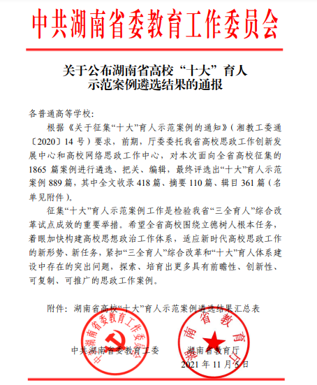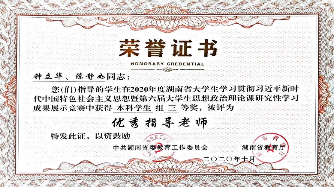 二、教学科研求真务实。该同志忠诚于党的教育事业,全身心投入到高校思政课教学工作之中,潜心钻研教学,认真备课,遵循科学创新的教育原则精心设计每一节课,注重提高教学实效。他每个学期担任6个合班的教学任务,教学效果良好,2021、2022年度教师课堂教学考核优秀。他主持各级科研和教研教改课题12项,指导员工参加云顶国际8588yd思想政治理论课研究性学习成果展示竞赛,获第六届特等奖、第七届二等奖、第八届一等奖、第九届一等奖,2020、2021、2022、2023年均被评为“优秀指导老师”以及2020年省级三等奖优秀指导教师,入选湖南省高校“十大”育人示范案例(全文收录)。