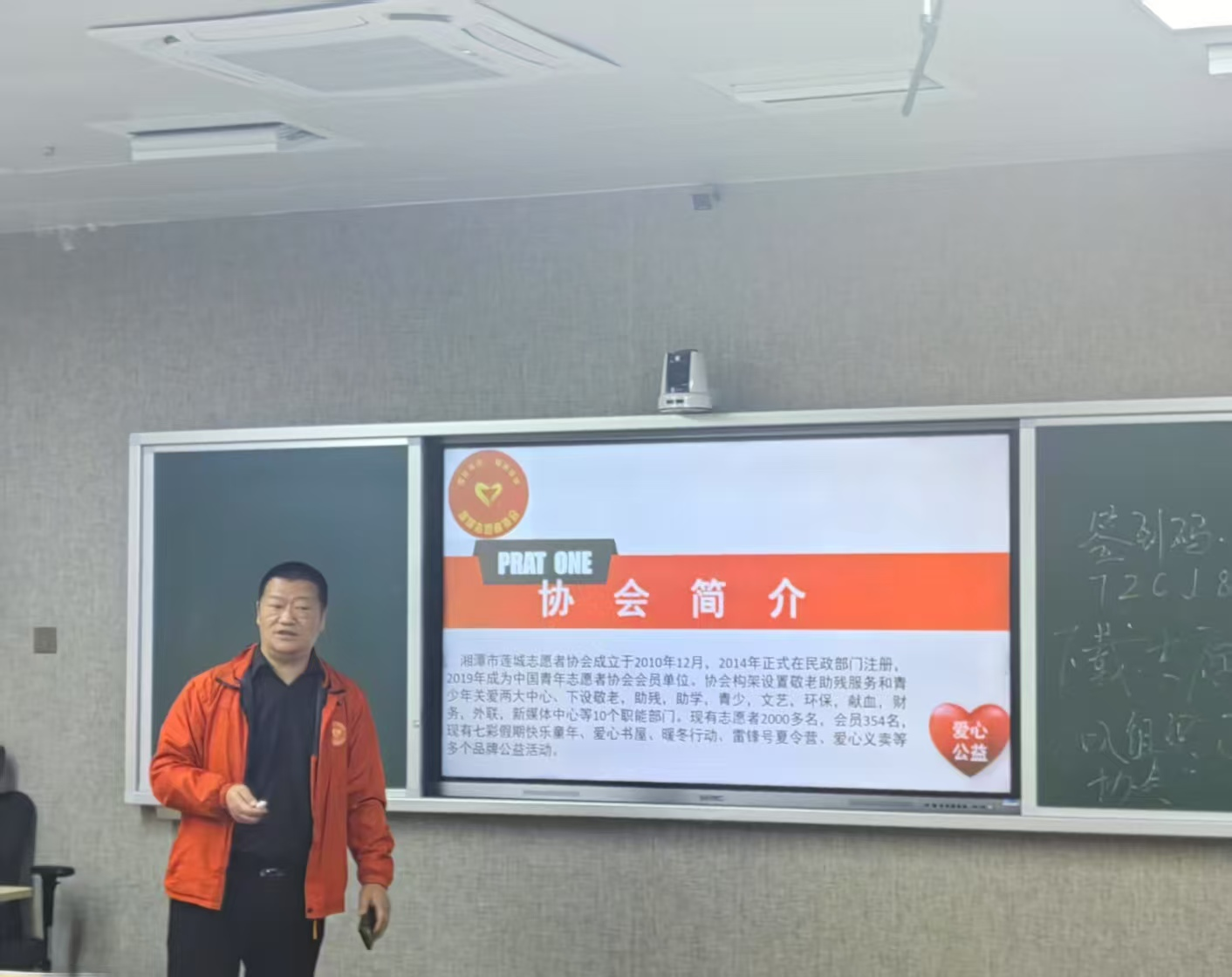 2025年4月24日下午,云顶国际8588yd思想道德与法治教研室特邀湘潭市莲城志愿者协会会长杨波为师生们带来一堂题为“志愿服务与新时代青年的使命担当”的思政课。依托A502智慧教室,课程在多个班级同步直播,有近200名师生参与,现场互动热烈,反响深刻。