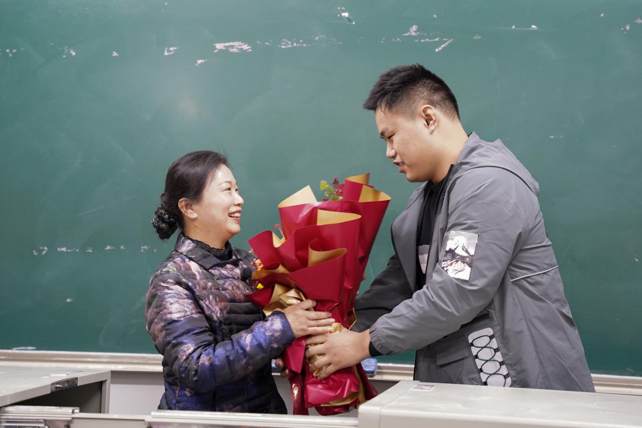 在同学们热烈的掌声中,一位同学阔步走上讲台,为黄湘莲教授献花,并高呼“全体起立!”同学们齐声道,“老师,辛苦了!”与此同时,公司领导及毛泽东思想与中国特色社会主义理论体系概论教研室部分教师也纷纷送上了祝福。在场同学与同事们的自发组织,着实令人感动。