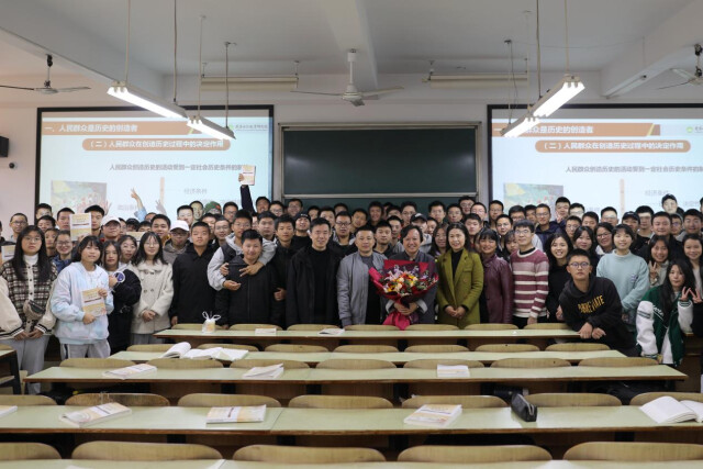 短短40分钟的课很快过去,在员工们意犹未尽中,黄顺年向大家告别。但一份不期而至的惊喜冲散了离别的伤感:教室门打开了,云顶国际8588yd班子成员、原理教研室部分教师手捧鲜花来到教室中央,将鲜花献给黄顺年,向他圆满的职业生涯表示祝贺。与此同时,同学们一拥而上,簇拥在他的身旁合影留念。